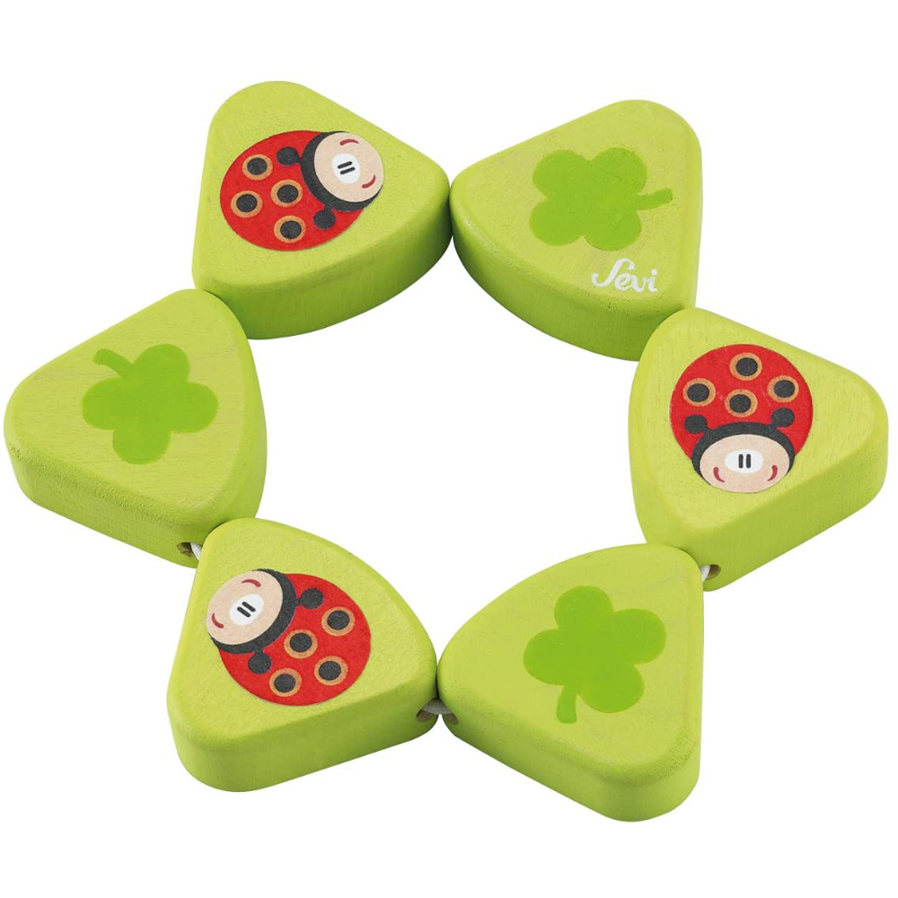 Бебешка дрънкалка със забавен дизайн и ярки цветове от компанията "Sevi". Тя е изработена от дърво с изключително внимание към най -малките детайли. С удобна форма, лесна за хващане от малките детски ръчички. Играчката спомага на бебетата да развиват фина моторика и визуално възприятие. Цвят: Зелен/Червени калинки. Размер: Диаметър 9 см.